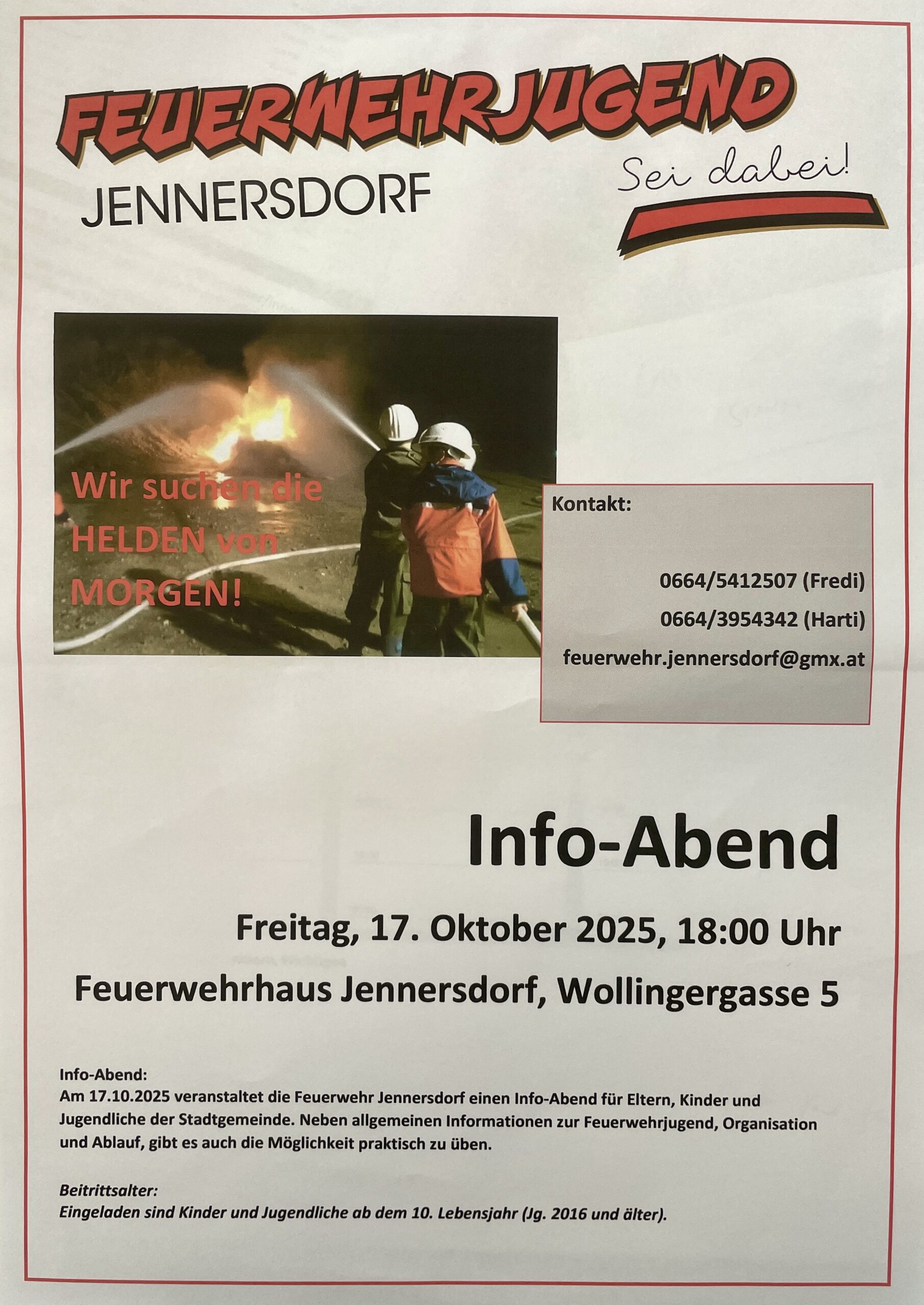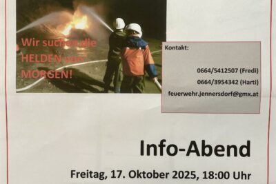 Am 17.10.2025 veranstaltet die Feuerwehr Jennersdorf einen Info-Abend für Eltern, Kinder und Jugendliche der Stadtgemeinde. Neben allgemeinen Informationen zur Feuerwehrjugend, Organisation und Ablauf, gibt es auch die Möglichkeit praktisch zu üben.